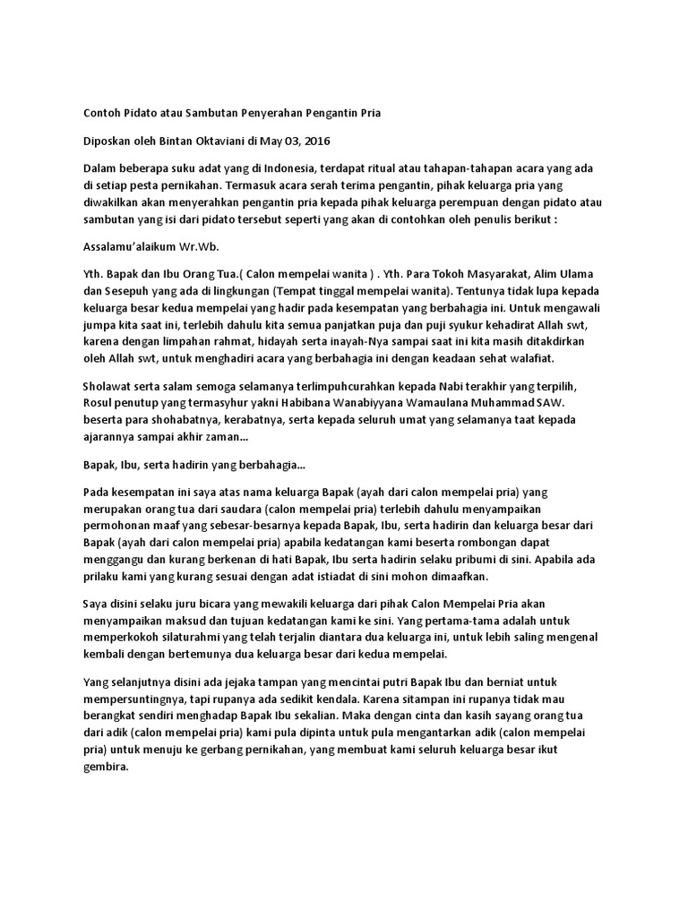 Contoh pidato atau sambutan penyerahan pengantin pria dalam beberapa suku adat yang di indonesia terdapat ritual atau tahapan tahapan acara yang ada di setiap pesta pernikahan. Contoh Pidato atau Sambutan Penyerahan Pengantin Pria. Pidato Penyerahan Pengantin Memakai Bahasa Jawa.